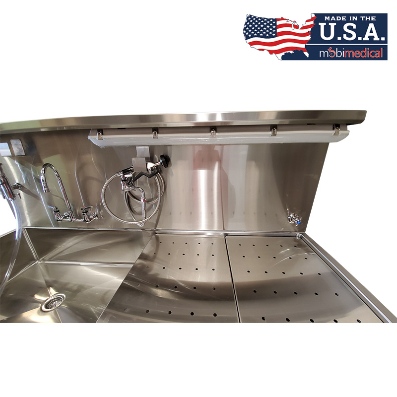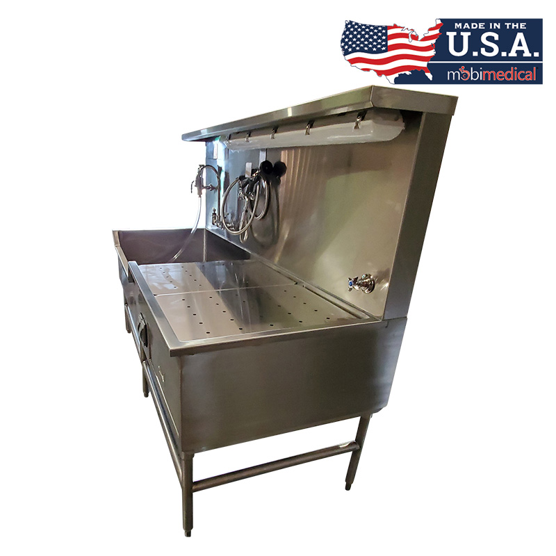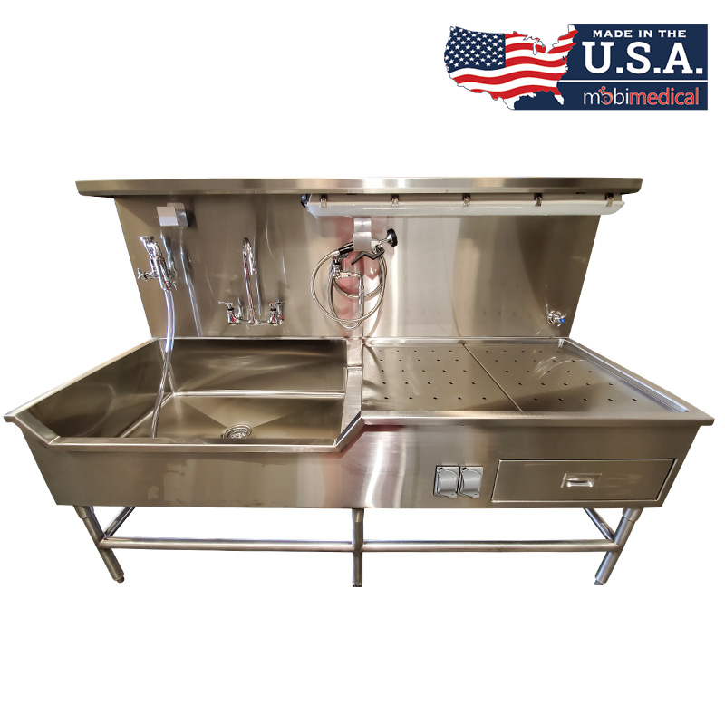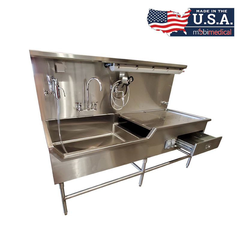 The Mobimedical Autopsy Station is constructed with 304 stainless steel, is heliarc welded, and is polished and smooth for easy cleaning and sanitation. These units are built to order, allowing full custom solutions to best fit your prep room needs.
