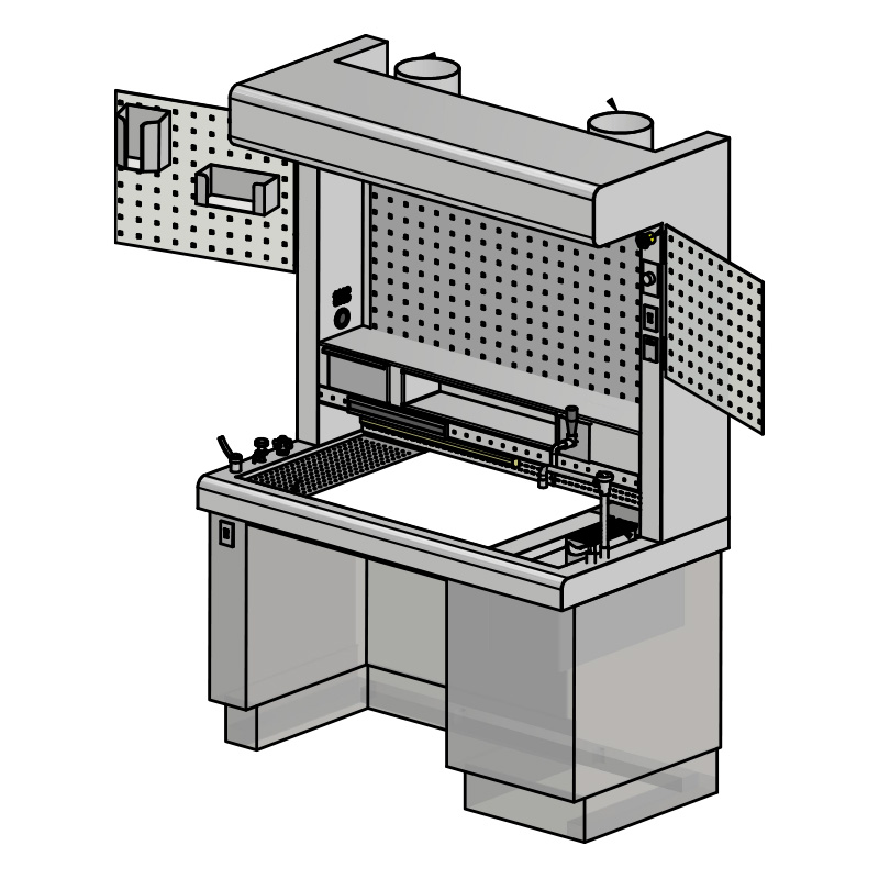 The MobiElite is designed around the gross technician’s range of motion. An adjustable-height work surface accommodates standing and seated operation, reducing musculoskeletal strain during extended dissection sessions. Integrated tool rails, specimen container recesses, and a dedicated dictation arm keep the work field organized and instruments immediately accessible — minimizing procedural interruptions and supporting accurate, efficient documentation.
